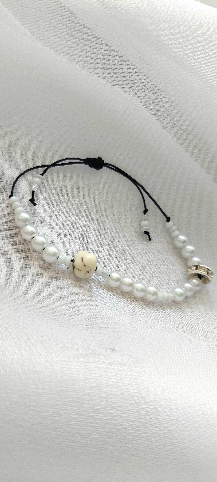 Elegancka i uniwersalna bransoletka, która doskonale komponuje się z każdą stylizacją. Wykonana ze szklanych pereł woskowanych gładkiego Howlitu.